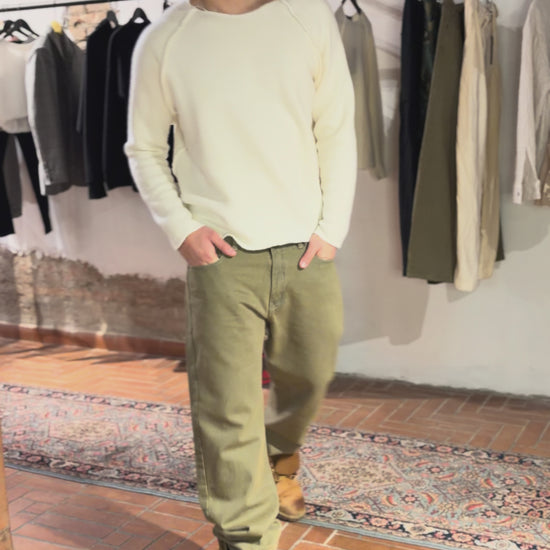 Prodotto a mano interamente in Italia con cuciture visibili e taglio boxy fit.